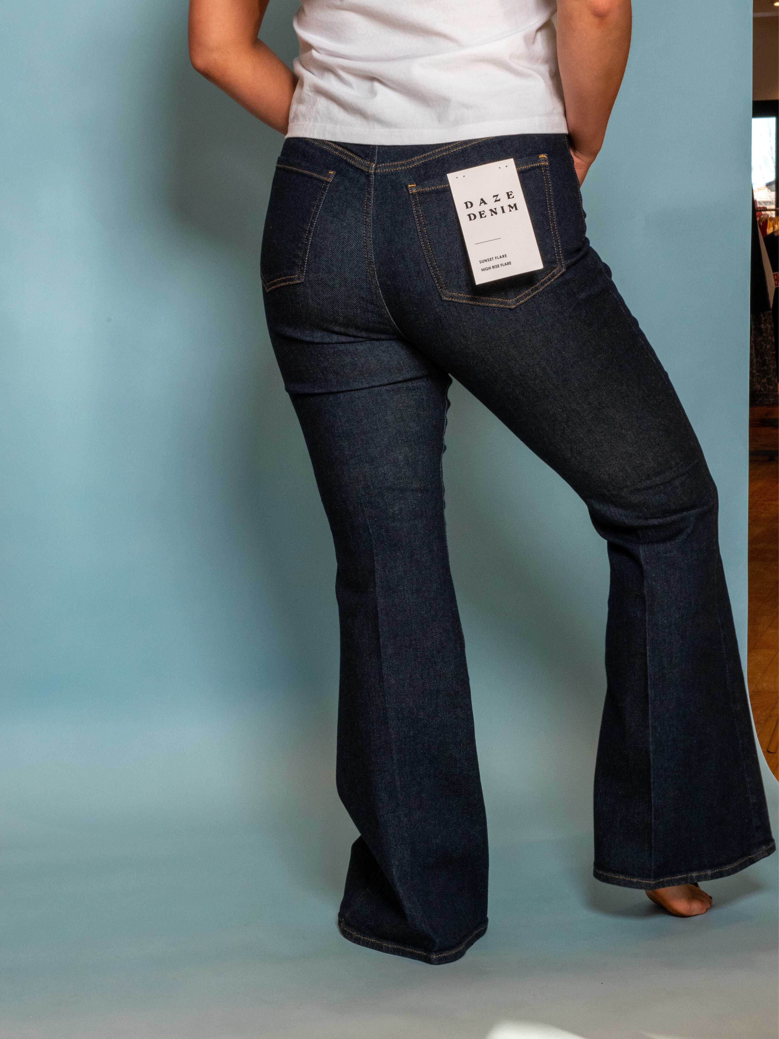 The Sunset Flare in Rinse is a high rise flared jean in a rich dark wash. This flattering fit hugs you at the waist and flares dramatically from knee to ankle.