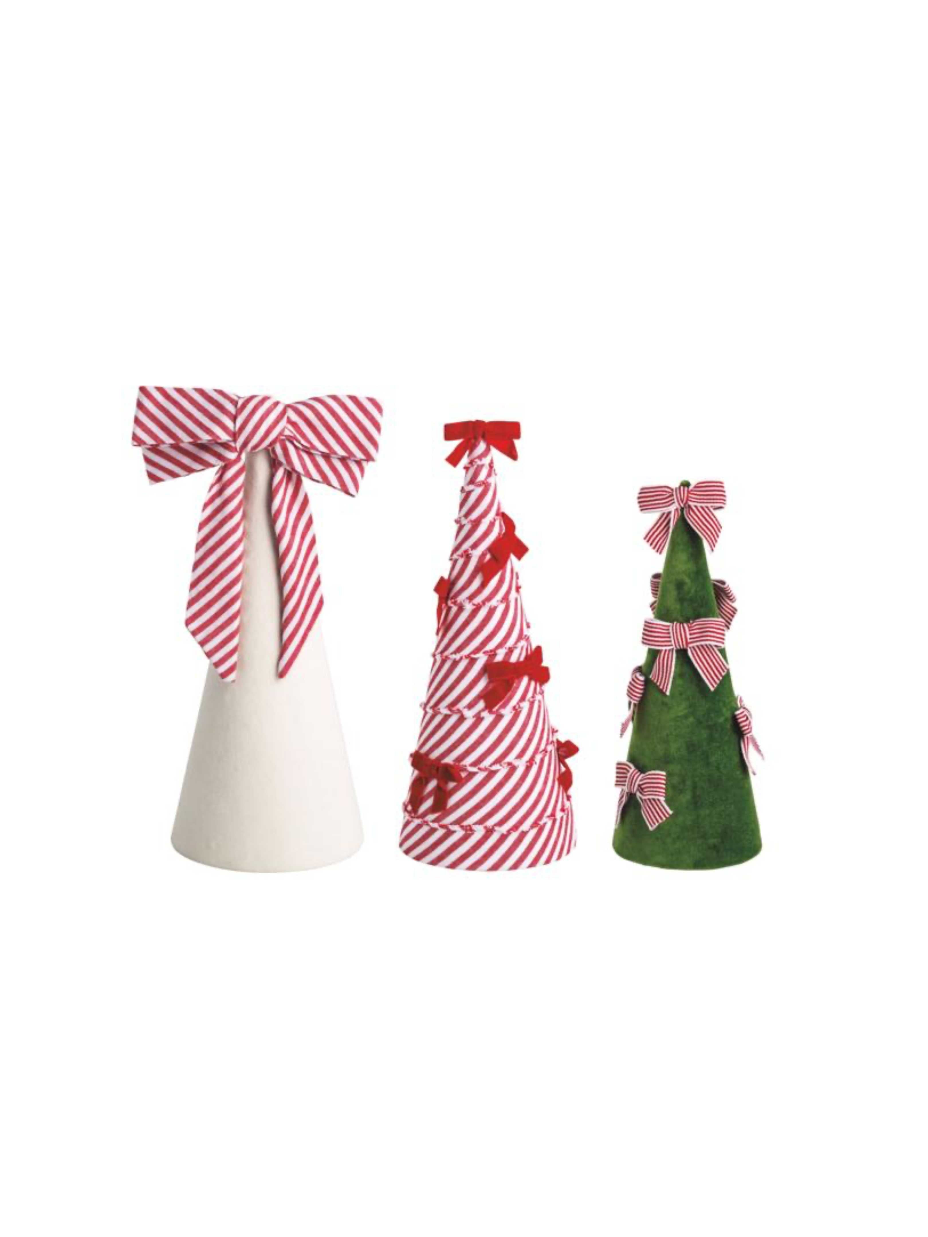 Bow Tree Sitters are a charming addition to your holiday decor, featuring a set of three beautifully crafted trees made from high-quality cotton and luxurious velvet. Each tree is adorned with elegant dimensional bows, adding a touch of sophistication and festive cheer to any setting. The set includes three different sizes to create a visually appealing display: the small tree measures 10 inches in height with a 4-inch diameter, the medium tree stands at 14 inches with a 5 1/2-inch diameter, and the large tree is 12 inches tall with a 5-inch diameter. These versatile decorations are perfect for tabletops, mantels, or as part of a larger holiday arrangement, bringing warmth and style to your home during the festive season.