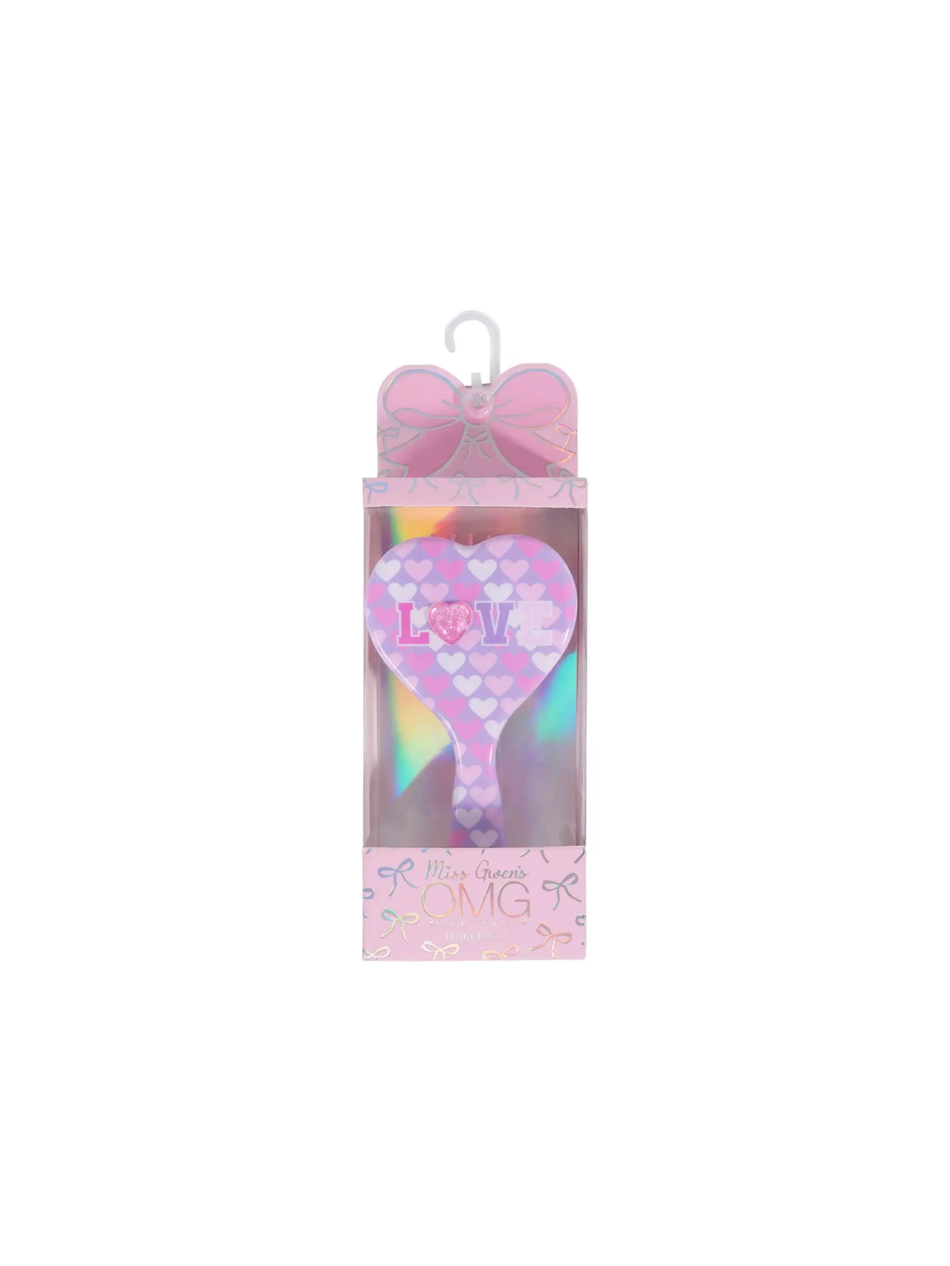 Dazzle and detangle with this 'LOVE' pink and lavender heart printed heart-shaped mini hair brush.