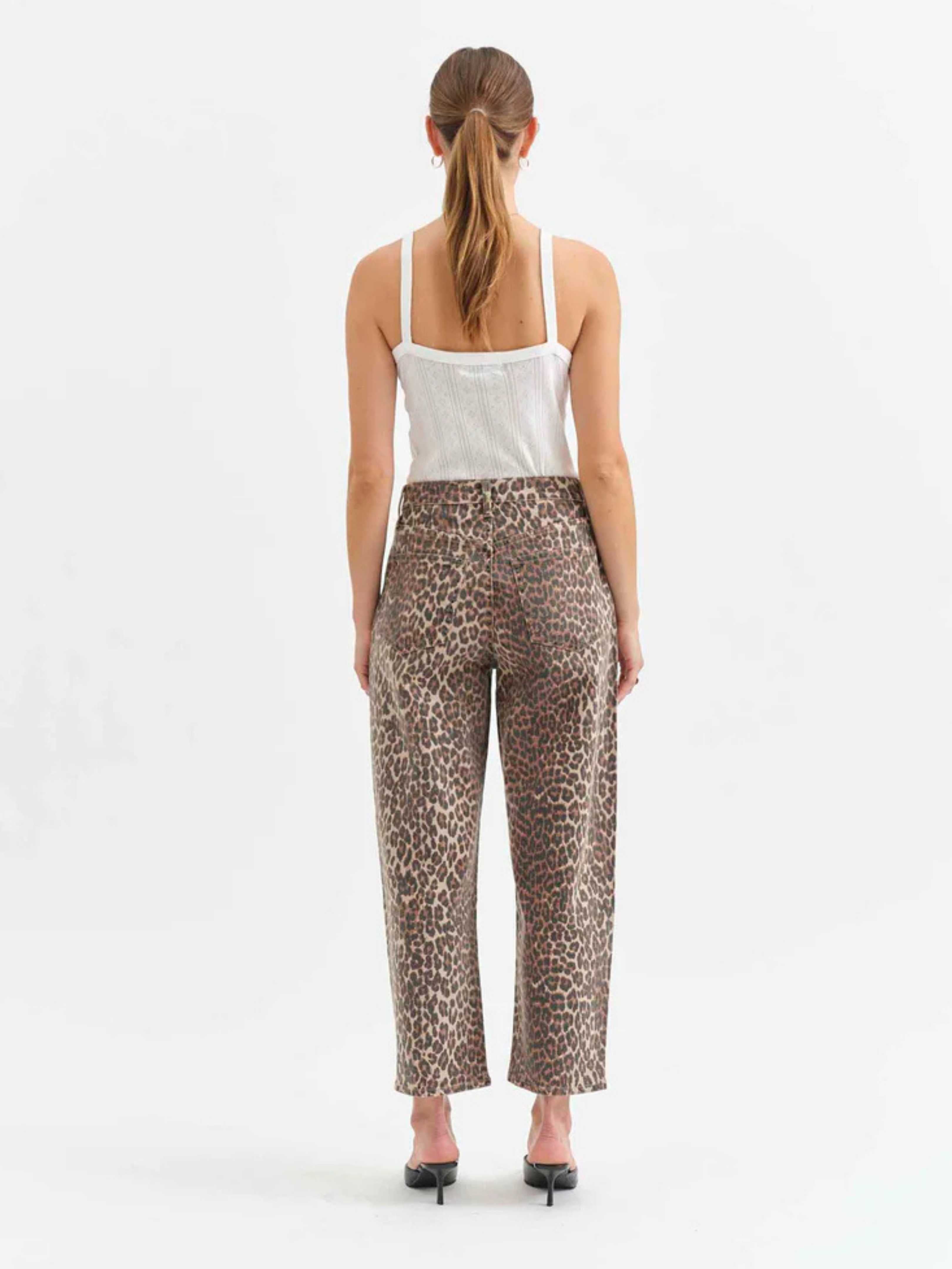 Go wild in the Westward - make a statement in the print of the season. The Westward in "Cool Cat" is a high rise jean with a trending barrel leg silhouette and a tan and black cheetah inspired print. Featuring a cinched waist, bowed leg, and slightly tapered ankle.