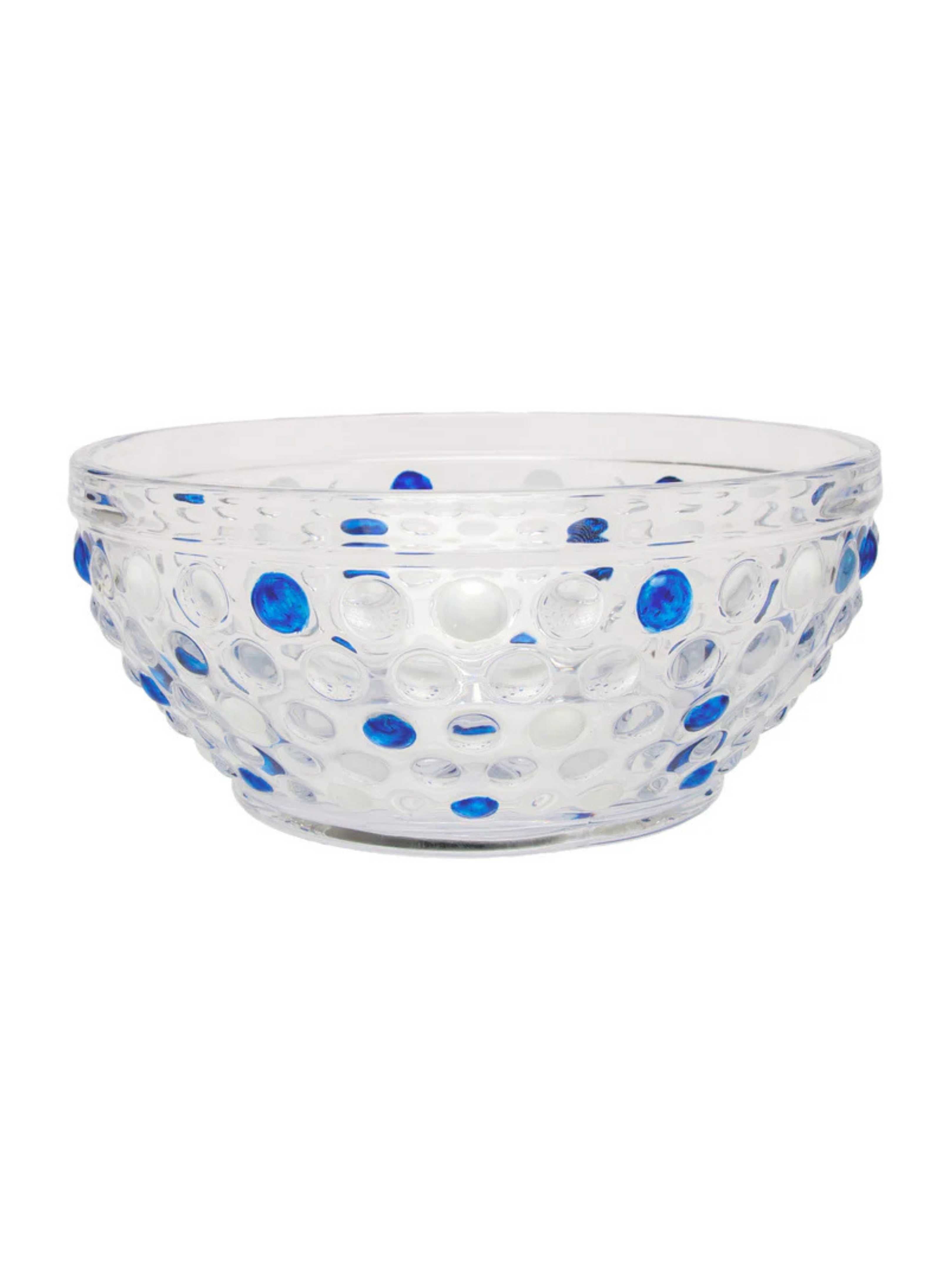 - A classic hobnail texture meets playful pattern in this clear glass bowl, where raised dimples frame vibrant blue and soft white dots that catch the light beautifully. Ideal for salads, fruit, or side dishes, it brings artful dimension and everyday polish to any table.