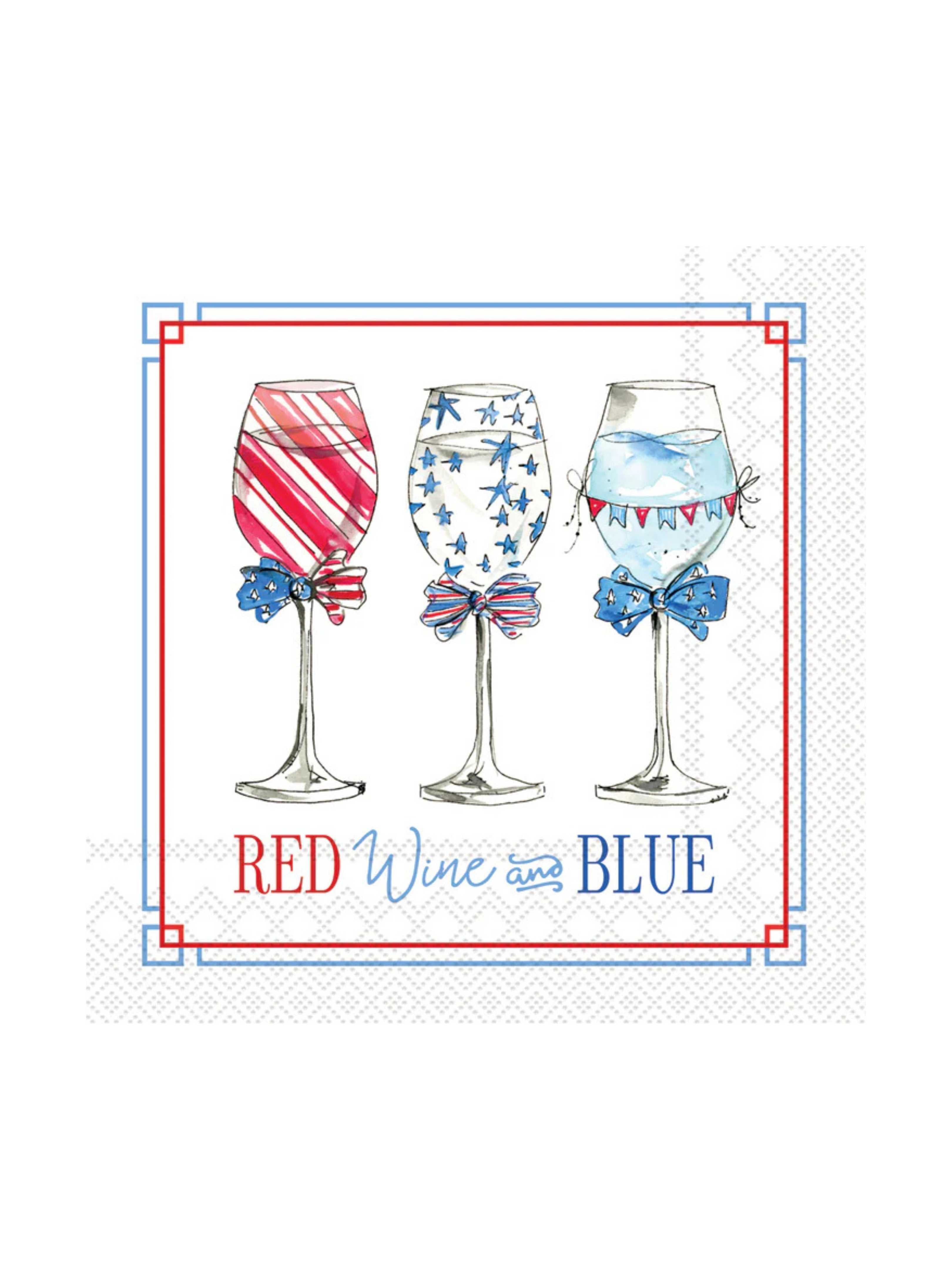 - Toast to spirited sips with these printed paper cocktail napkins featuring watercolor wine glasses decked in stars, stripes, and bows around the playful “Red Wine and Blue” message. A lively finishing touch for bar carts, tastings, and casual gatherings, the Patriotic Wine design keeps drips in check while adding a bold pop of red, white, and blue. German printed on soft, 3-ply paper.