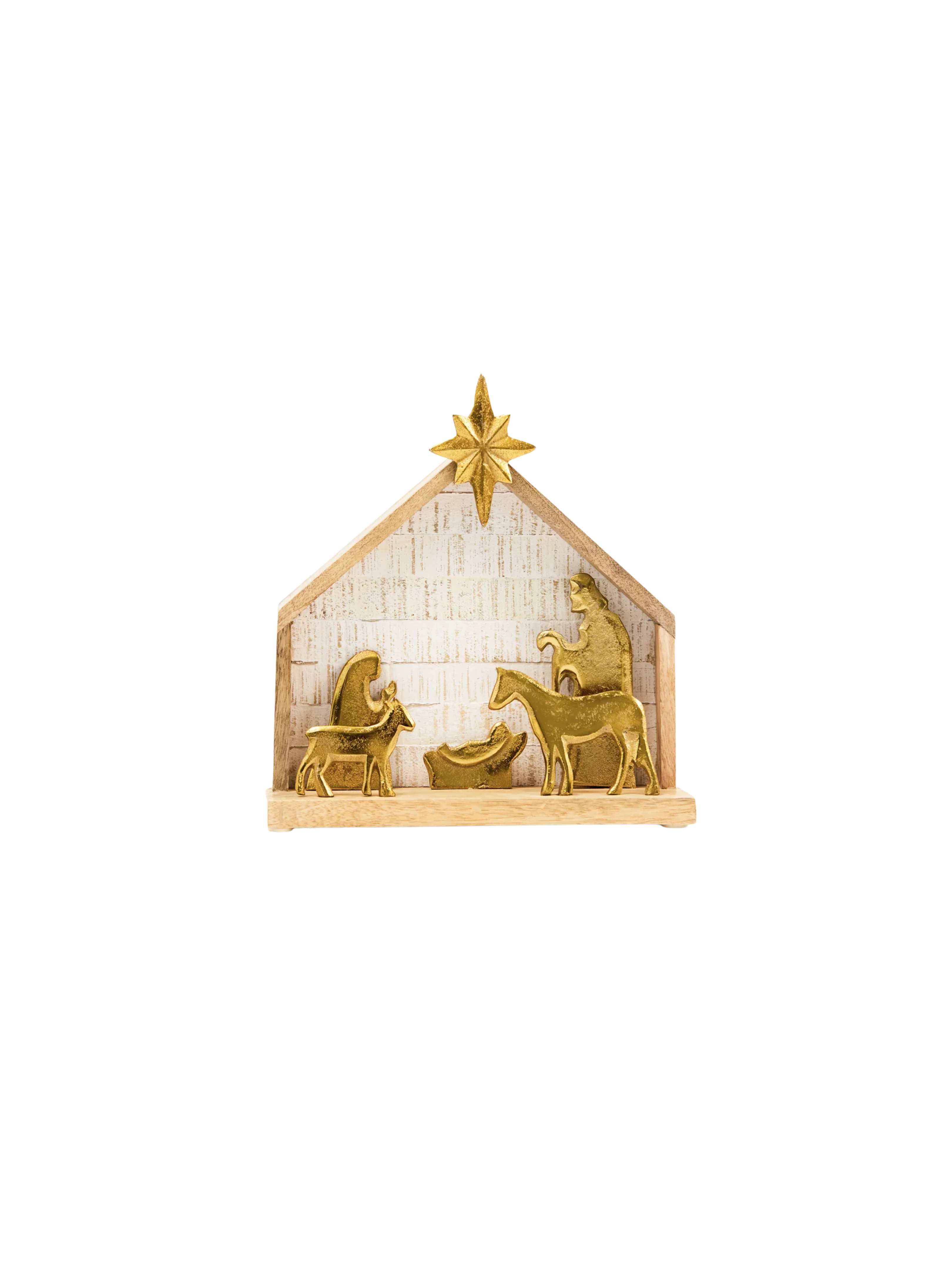 Our wood and gold nativity beautifully captures the spirit of the holidays with its classic design and warm, natural materials. Crafted from rich wood and accented with gleaming gold details, this nativity set brings a touch of elegance and reverence to your holiday decor.