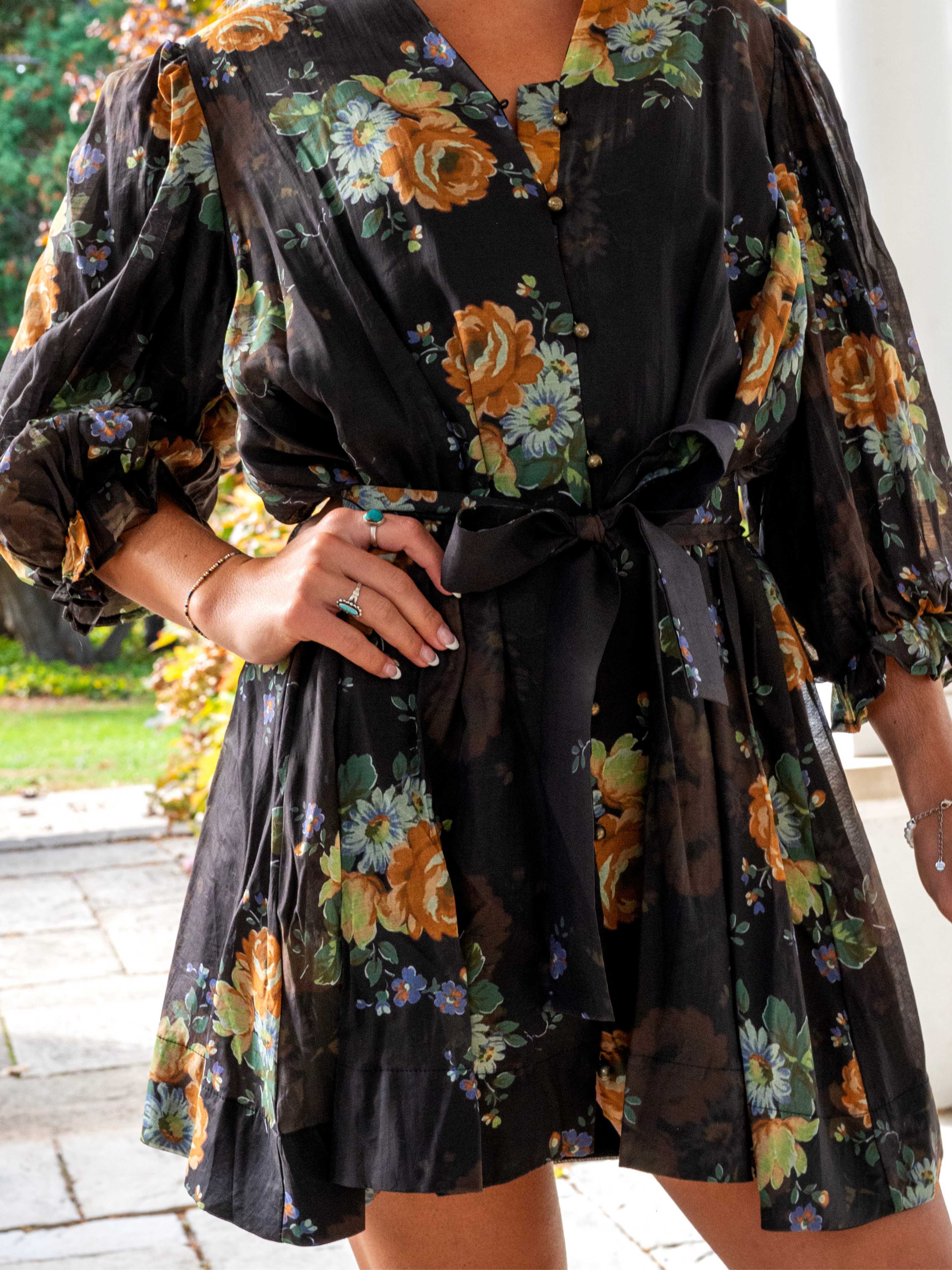 • Floral print puff 3/4 sleeve mini dress featuring ruffled accent neck band collar V-neck.