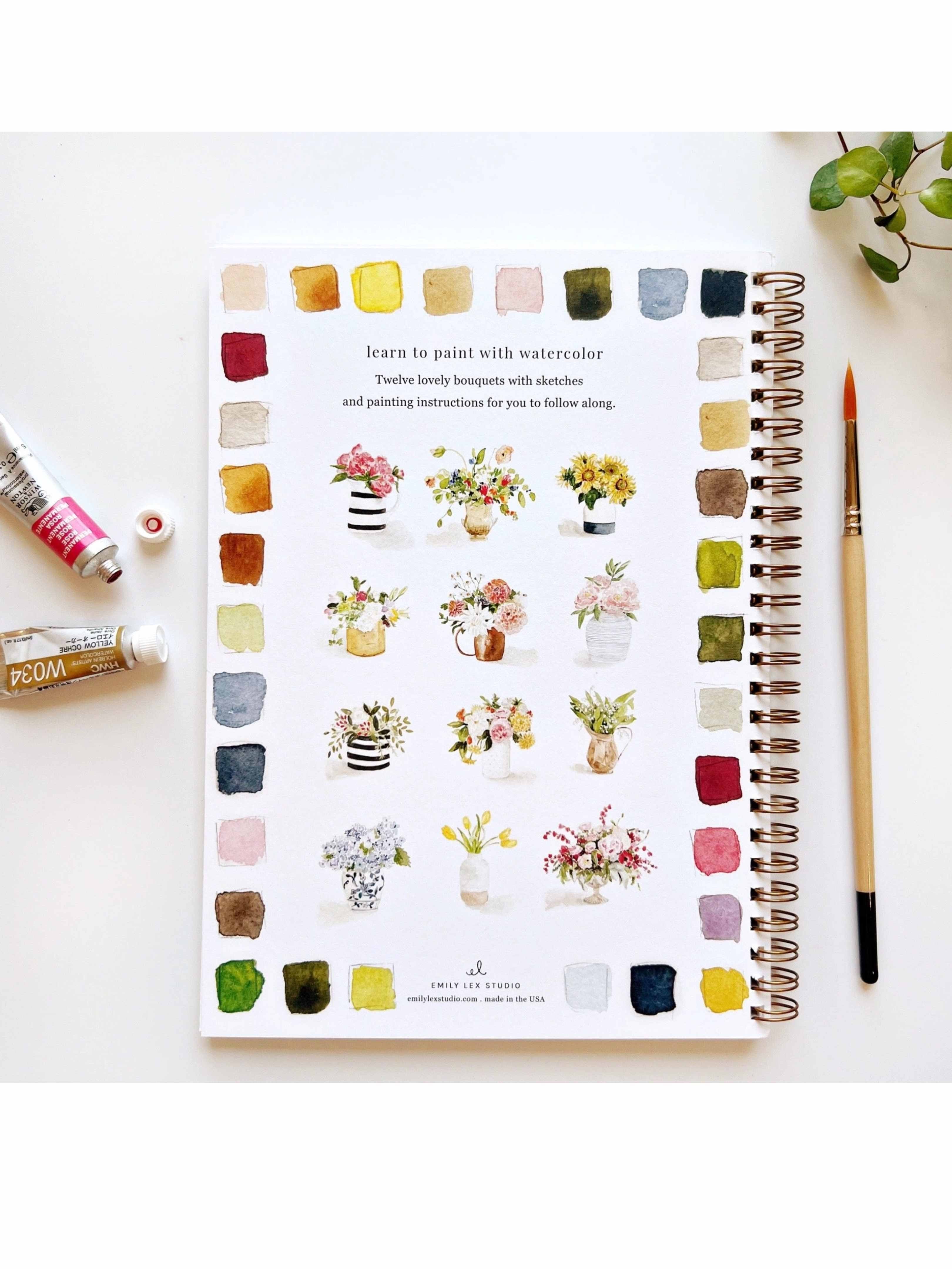 The Bouquets Watercolor Workbook includes 12 floral bouquet illustrations with an example of the finished painting, step-by-step instructions, and a lightly illustrated sketch for you to paint. It's just like a coloring book, but with watercolor! Enjoy this peaceful painting hobby on your own, with children, or with friends. Makes a wonderful gift and is perfect for artists of any age. Details: - 12 beginner-friendly illustrations - Thick 120lb watercolor paper - Lay-flat pages with spiral binding for hassle-free painting and easy tear-out - Lightly outlined sketches to guide you - Easy to carry, travel-ready 6.5" x 9" size
