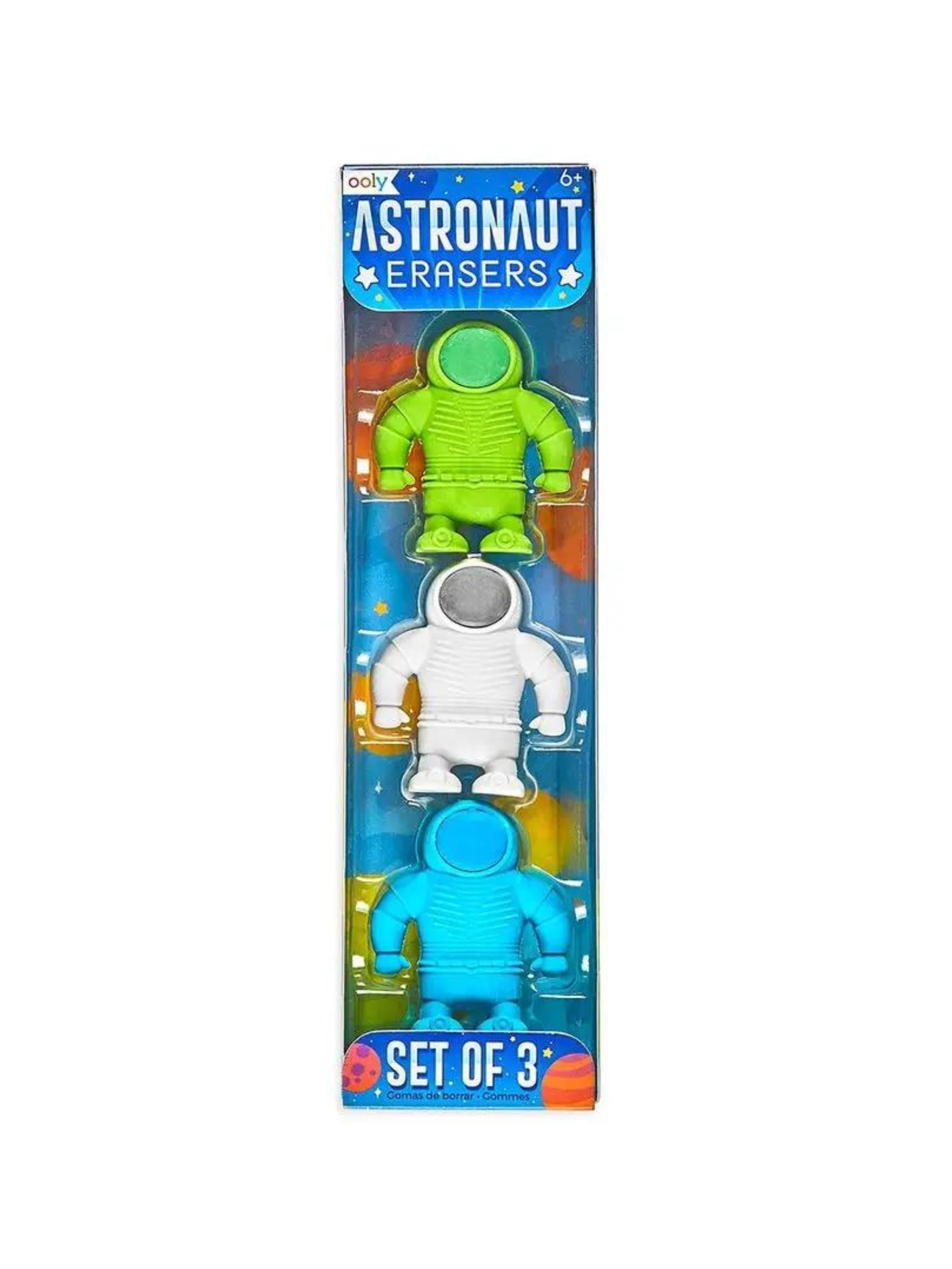 These astronaut erasers are perfect for little hand to grip and play with and also erasing pencil mistakes. The 3 novelty erasers come in green blue and white.