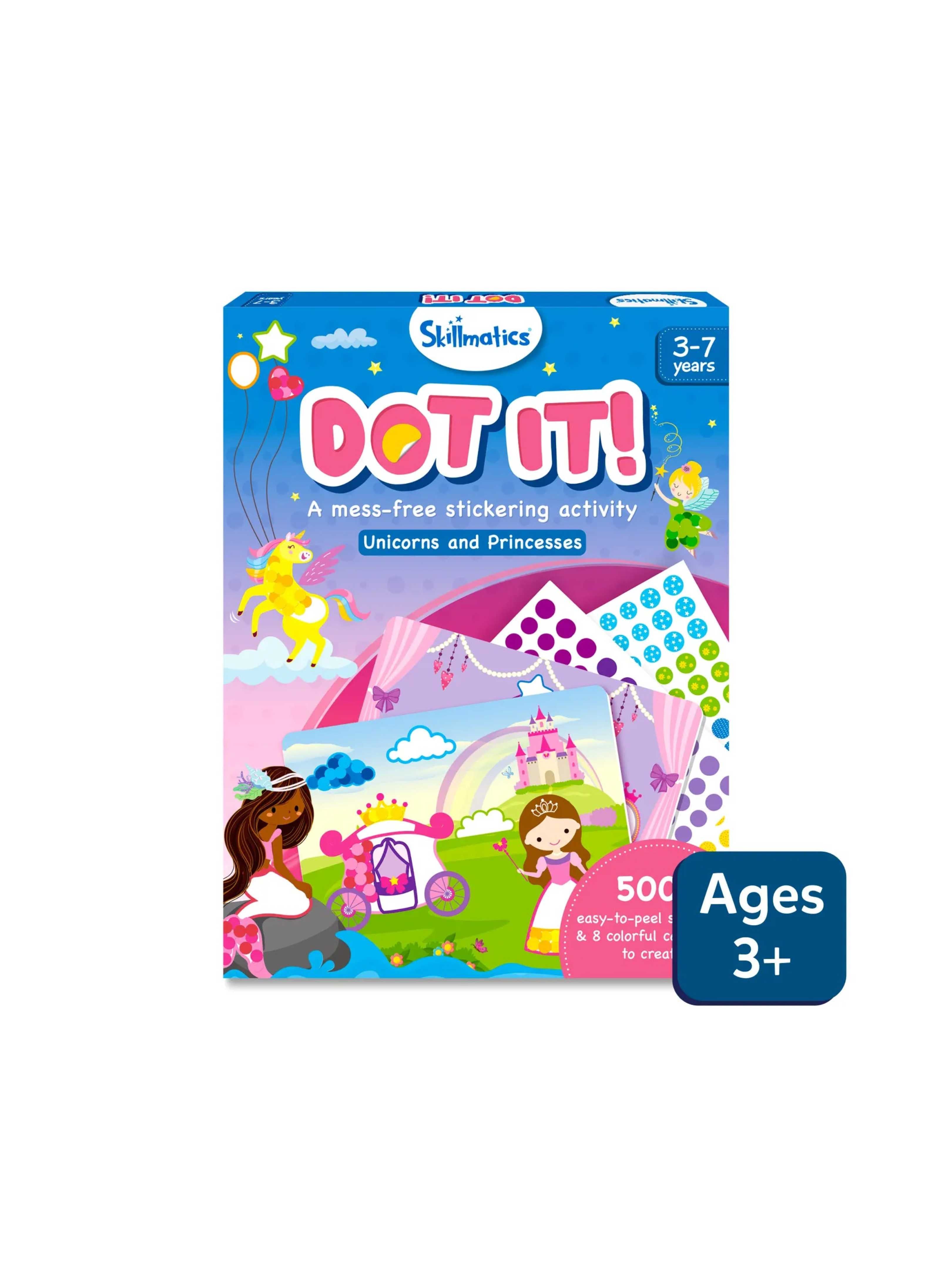 Dot it! is the perfect stickering, no-mess art activity that keeps kids engaged at home or on the go! Your child will use their fine motor skills and imagination to complete 8 magical unicorn and princess-themed pictures!