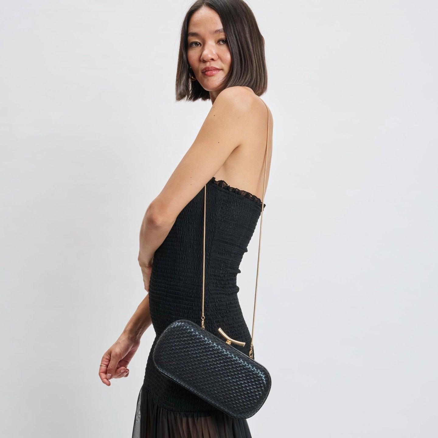 Its sleek silhouette and intricate texture add a touch of sophistication to any outfit. Featuring a versatile chain strap, this bag effortlessly transitions from clutch to crossbody, making it ideal for nightlife or formal events.