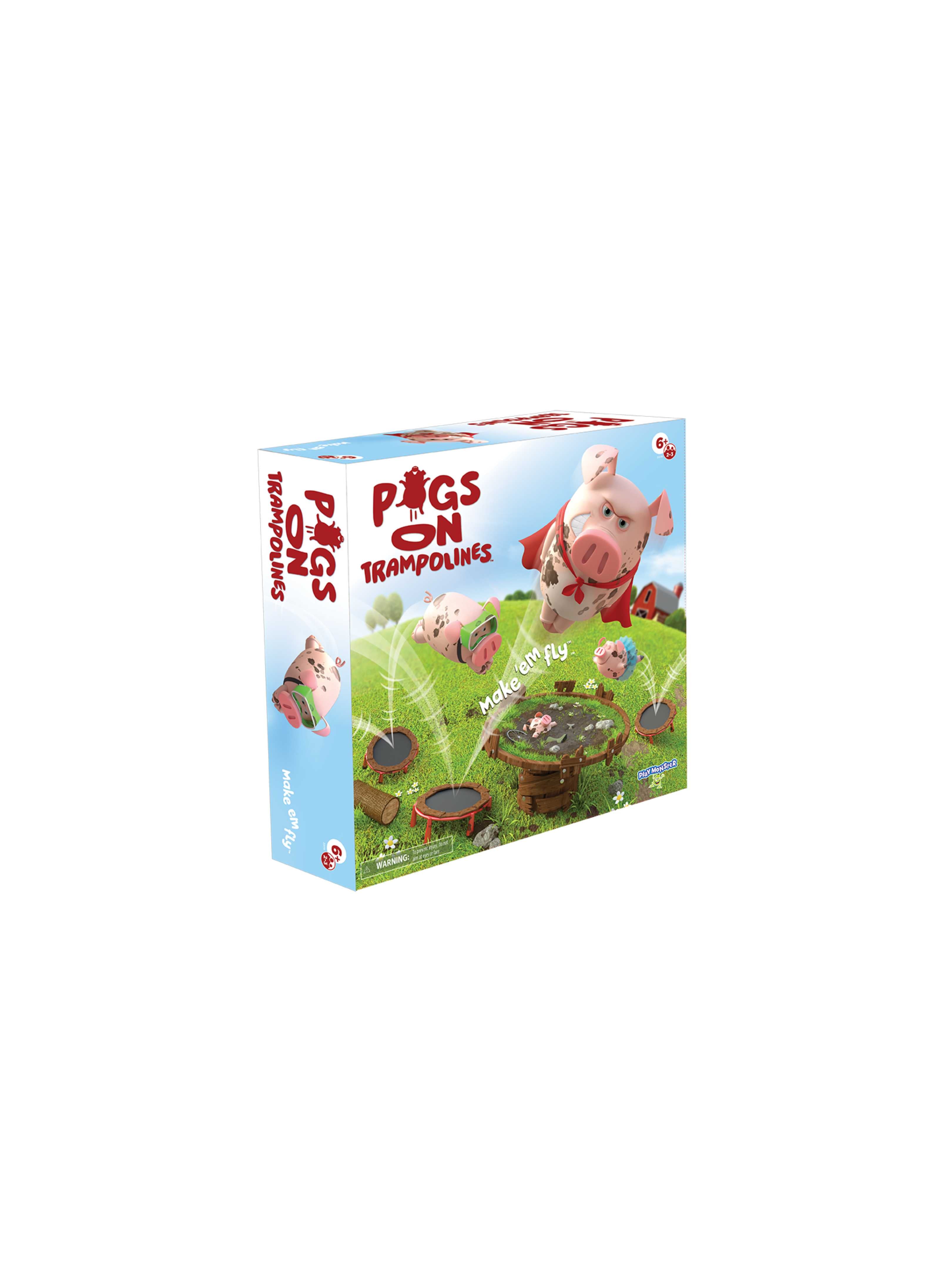 Jump for joy with Pigs on Trampolines! Use the trampolines to bounce your pigs into the pig pen and try to land in the mud puddle! Every pig you land in the puddle earns you a mud pie. Keep on bouncing your pigs until all the mud pies are gone—the muddiest piggy wins! Comes with 6 rubber pigs, 3 trampolines, 7 mud pies, pig pen (some assembly required), and instructions. For 2 to 3 players, ages 6 and up!