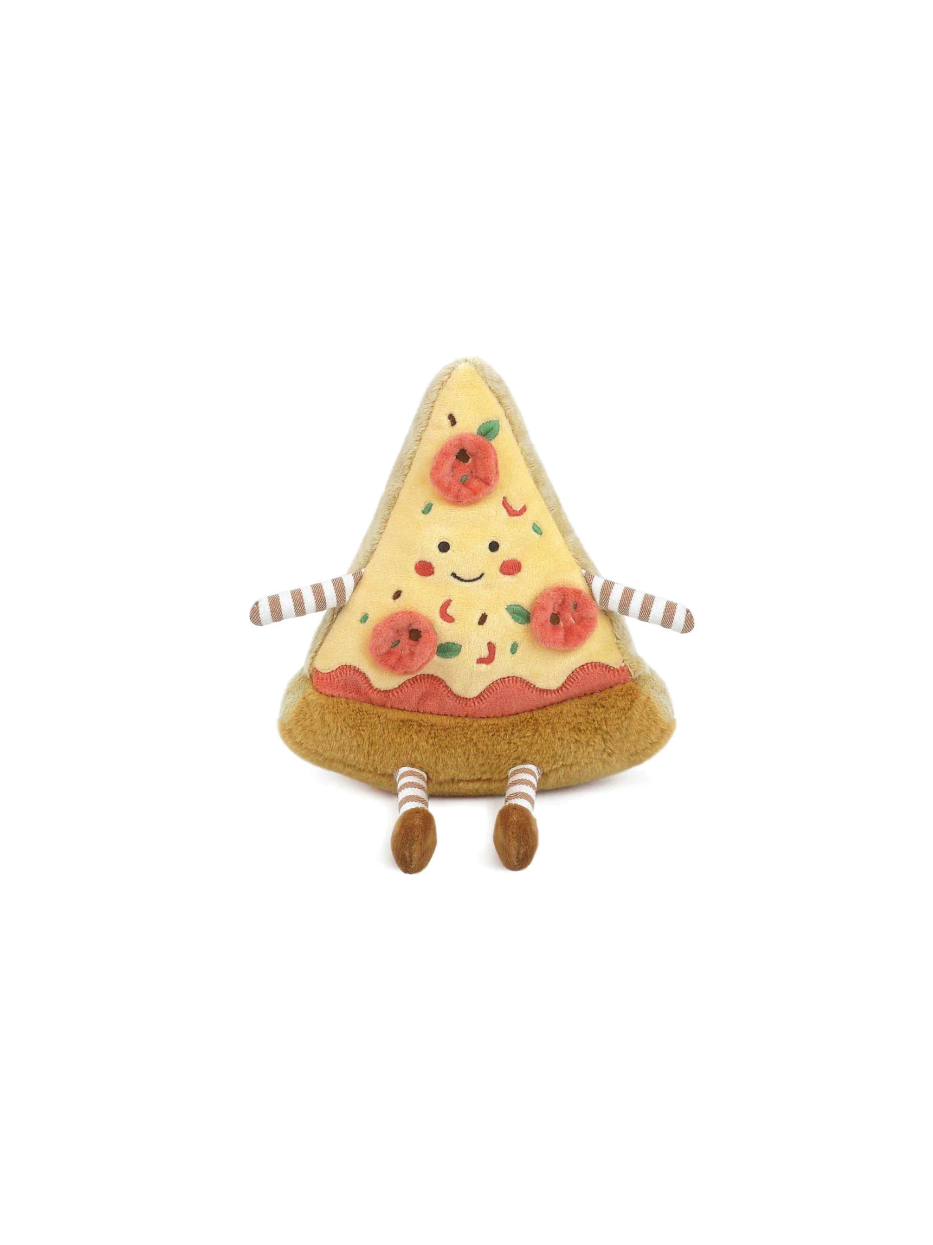 Cosimo Pizza Slice will definitely steal a pizza your heart. This pizza slice is a wonderful wedge of yummy colors. Our soft plush pizza slice has embroidered features such as rosy cheeks, a sweet smile, whimsical striped arms & legs, tow-tone colored crust and topped with the classic pepperoni topping.