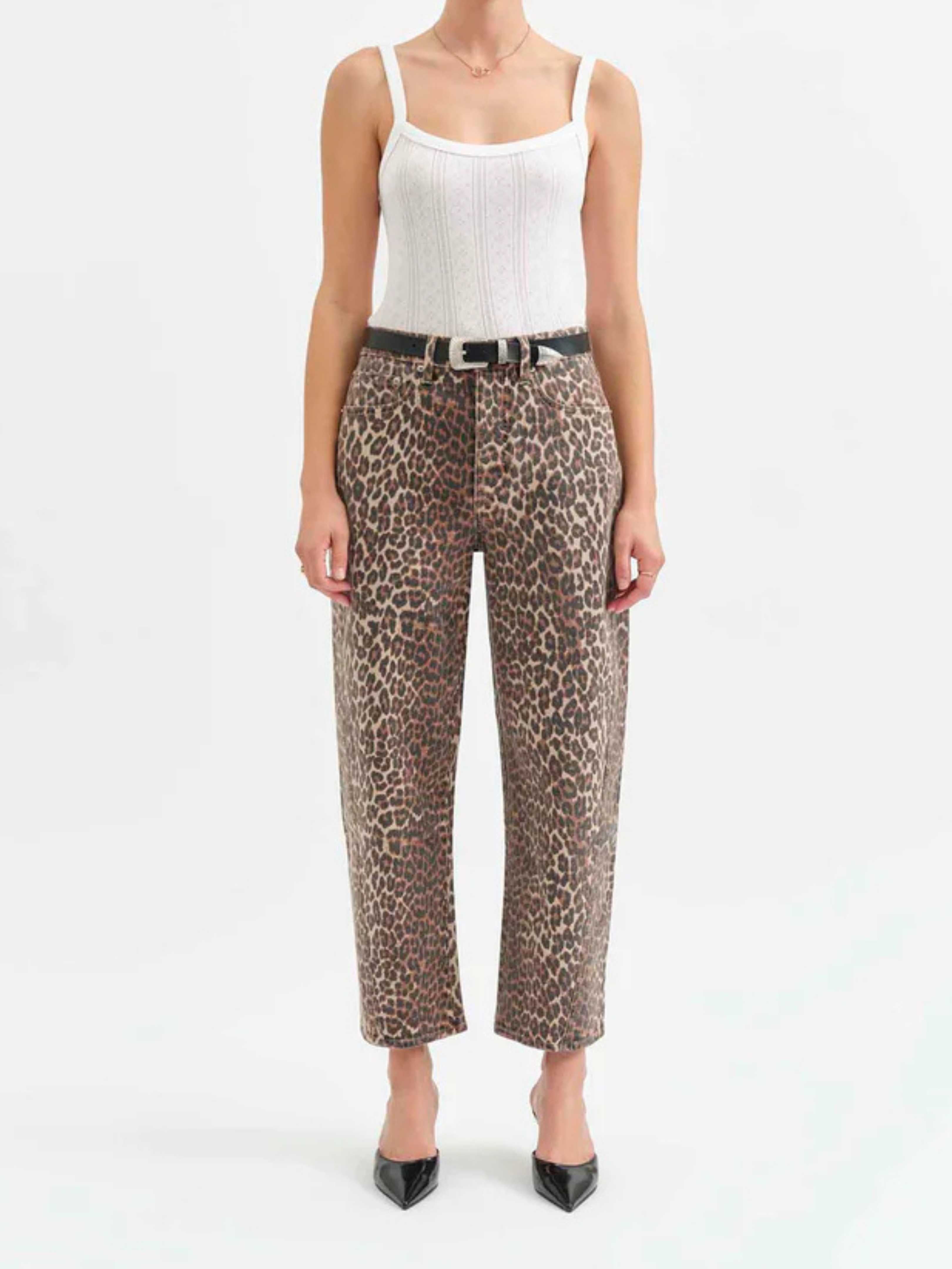 Go wild in the Westward - make a statement in the print of the season. The Westward in "Cool Cat" is a high rise jean with a trending barrel leg silhouette and a tan and black cheetah inspired print. Featuring a cinched waist, bowed leg, and slightly tapered ankle.