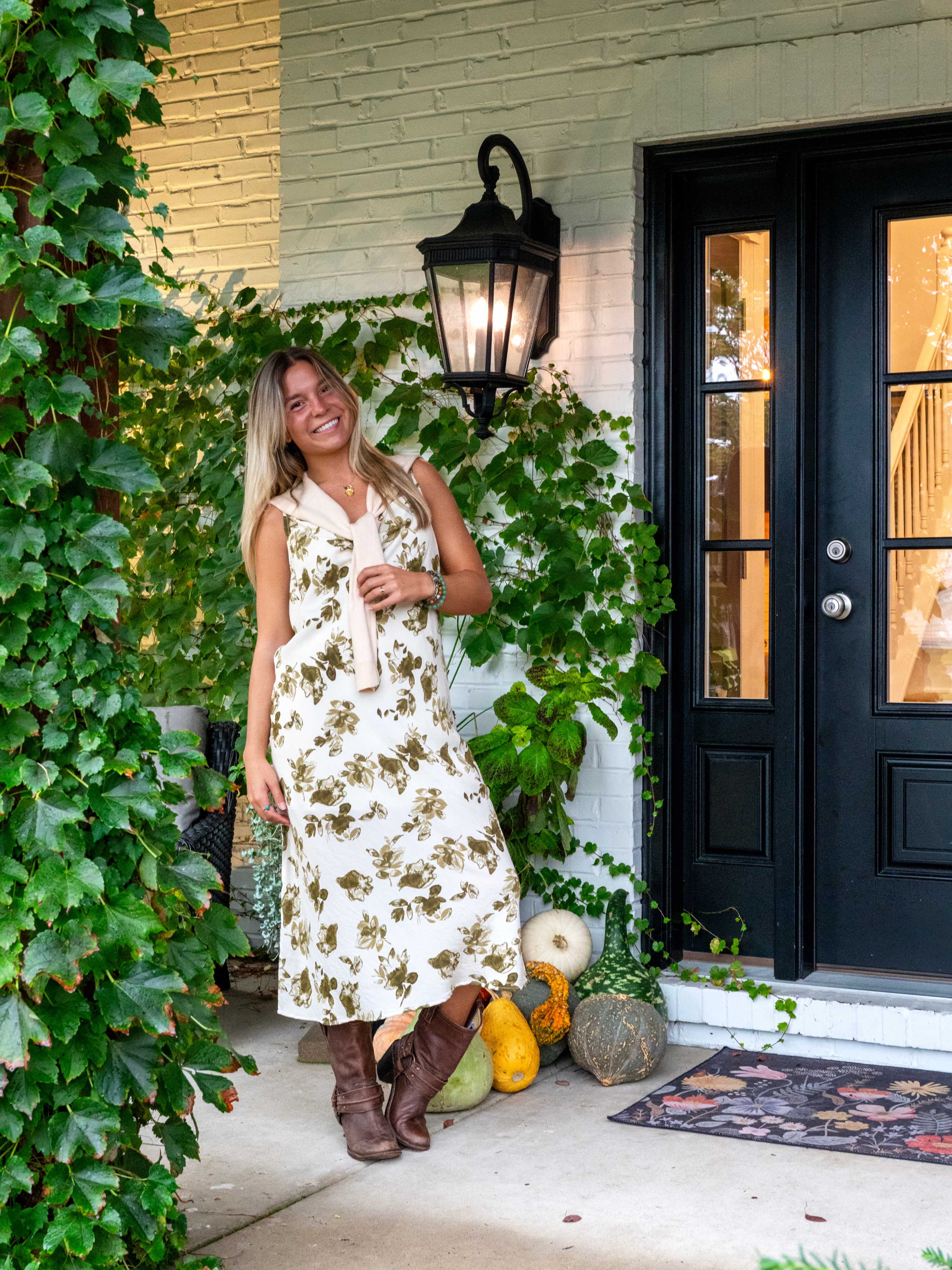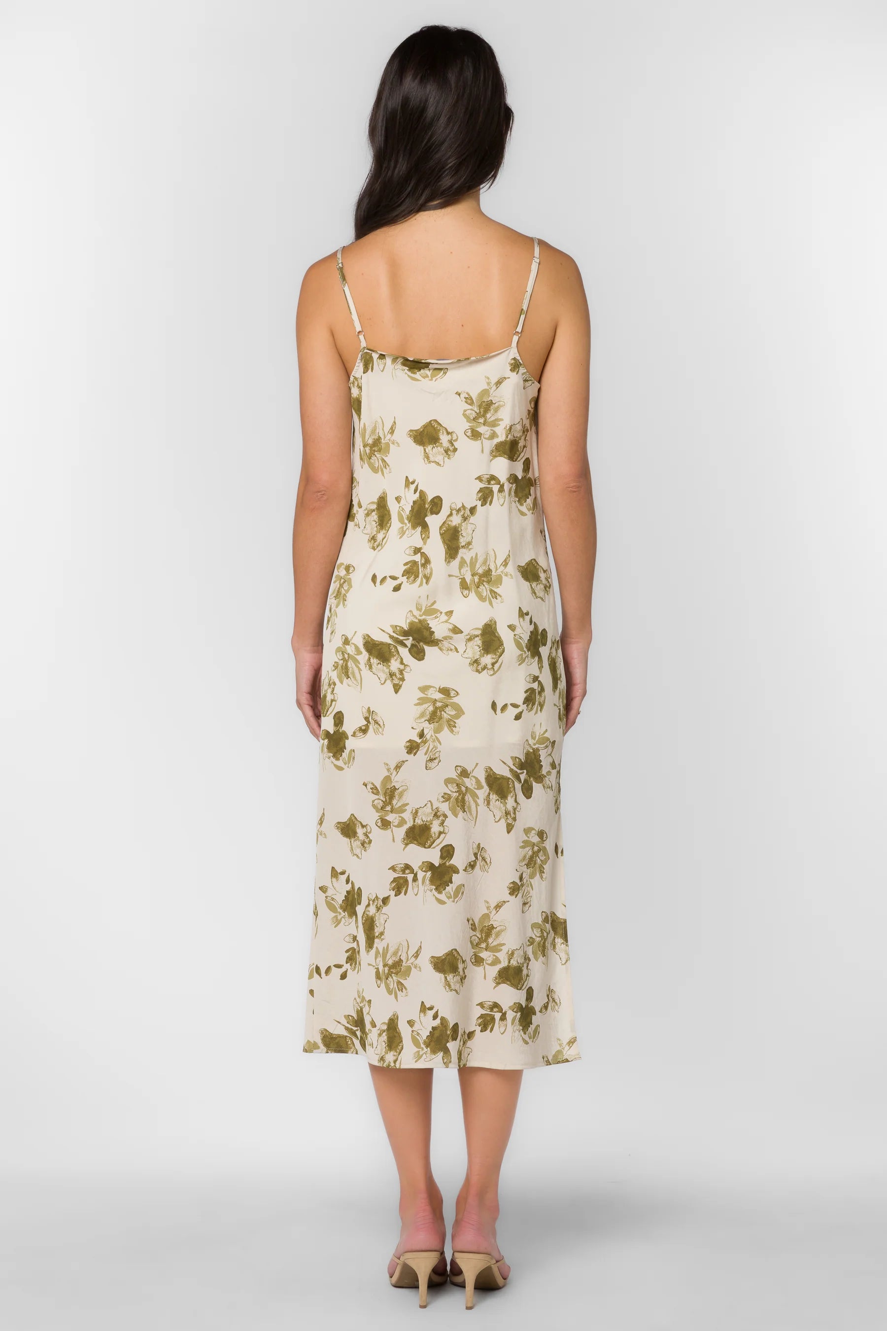 This floral slip dress features a cowl neck, a flattering midi-length silhouette, and a side slit. Crafted from a soft, lightweight fabric with a subtle crinkle texture and a flattering drape.