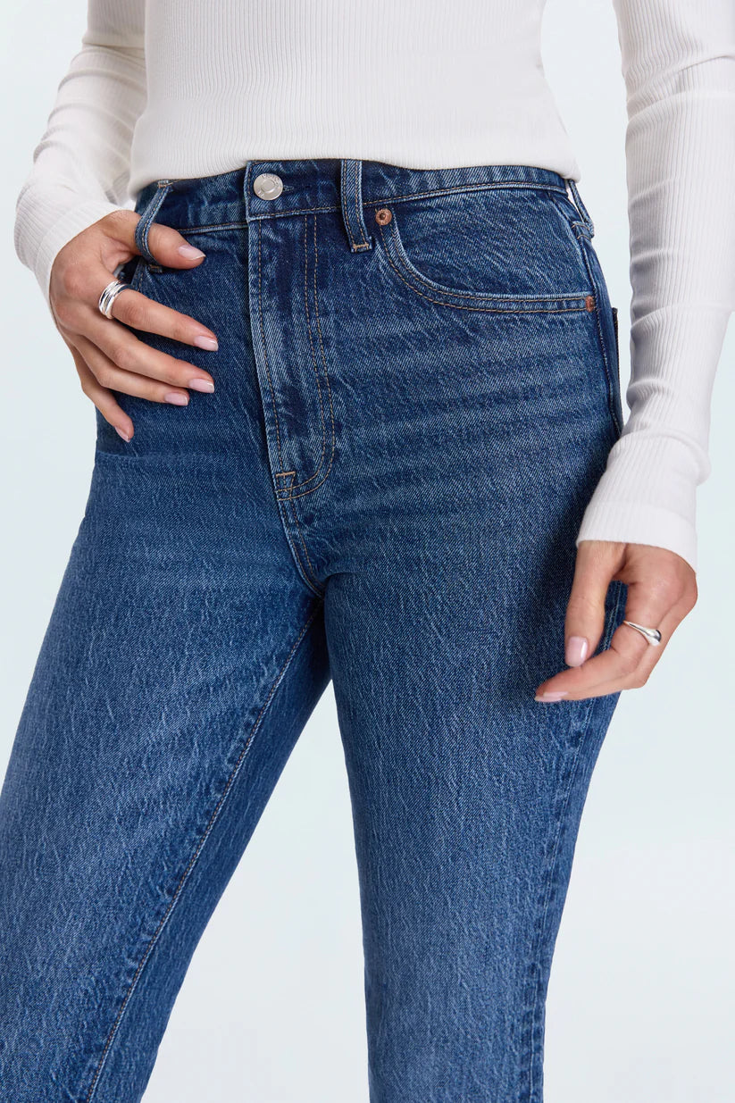 Bri offers a high rise, slim straight silhouette, and wider leg opening for clean lines with room to move. Crafted from comfort stretch denim in Victory, a rich medium blue with authentic fading and vintage character for a timeless lived-in look.