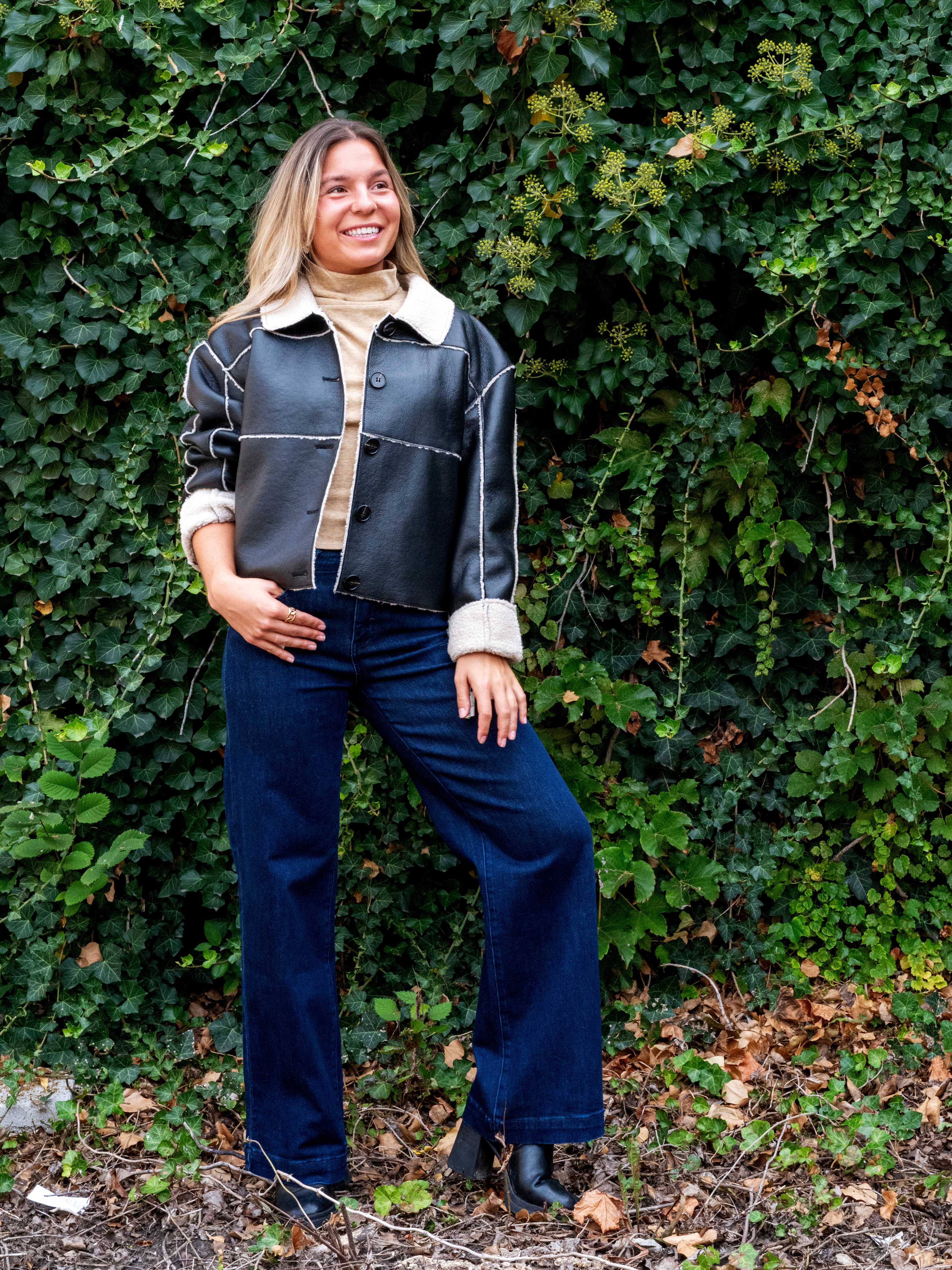 Featuring a long-sleeved silhouette and a luxurious faux fur collar, this faux leather jacket offers both style and comfort. Its button-up closure ensures a secure fit while enhancing the coat’s sleek, polished look.