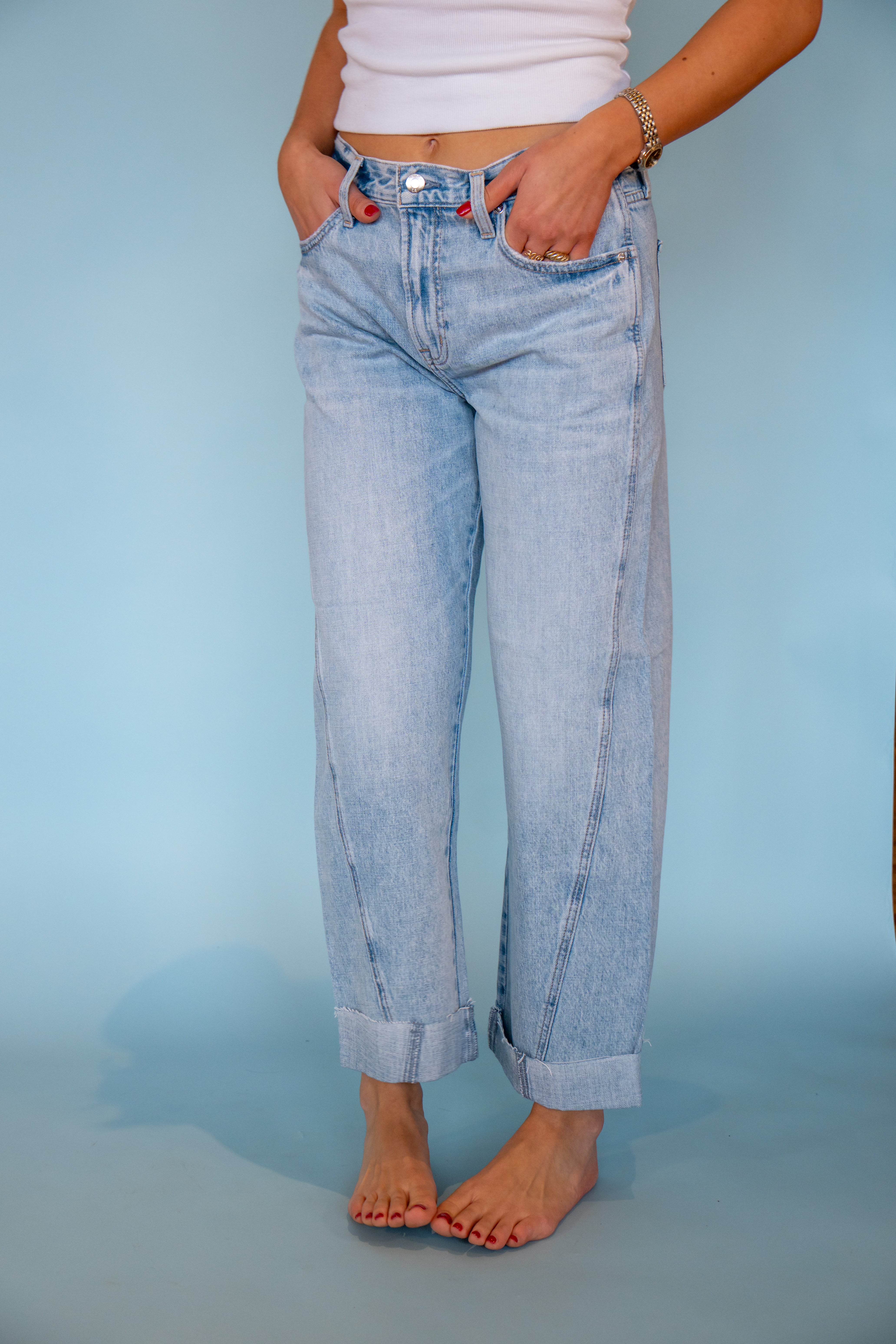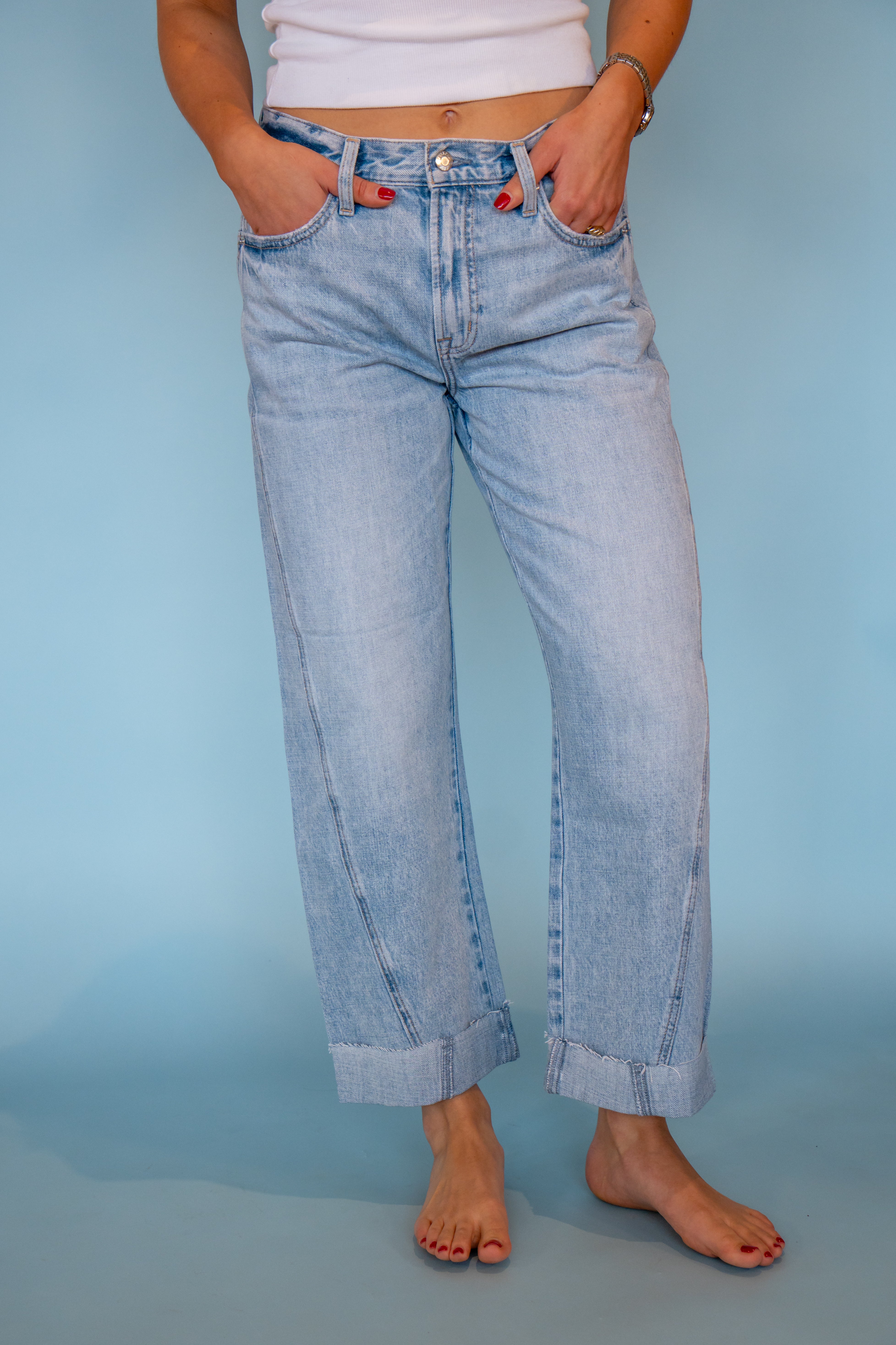 The Kacey Mid Rise Cuffed Boyfriend jeans are your new go-to for effortless style and comfort. This easy fit provides a relaxed yet flattering silhouette, perfect for any occasion. The light denim wash and cuffed hem offer a versatile look that can be dressed up or down, while the seaming detail creates a subtly elongated figure. Made from lightweight rigid denim, the Kacey jeans are going to be a staple piece in your closet.