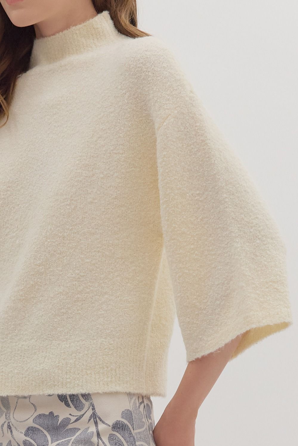 Solid 3/4 sleeve mock neck boucle sweater knit top. Unlined. Knit. Non-sheer. Medium weight.