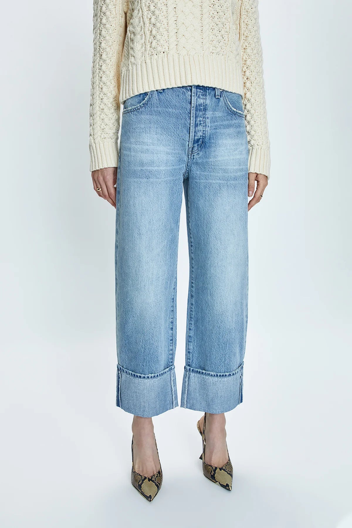 High-Rise Wide Leg Jeans in Essex Vintage. Meet your new favorite jeans. These high-rise jeans feature a relaxed, wide-leg fit, an oversized cuffed ankle hem, and are crafted from rigid, lightweight denim for a vintage-inspired look and feel. The Essex wash offers the perfect balance of light blue denim with vintage fading and whiskering.