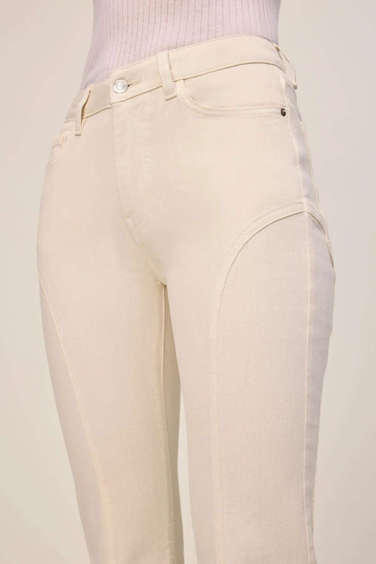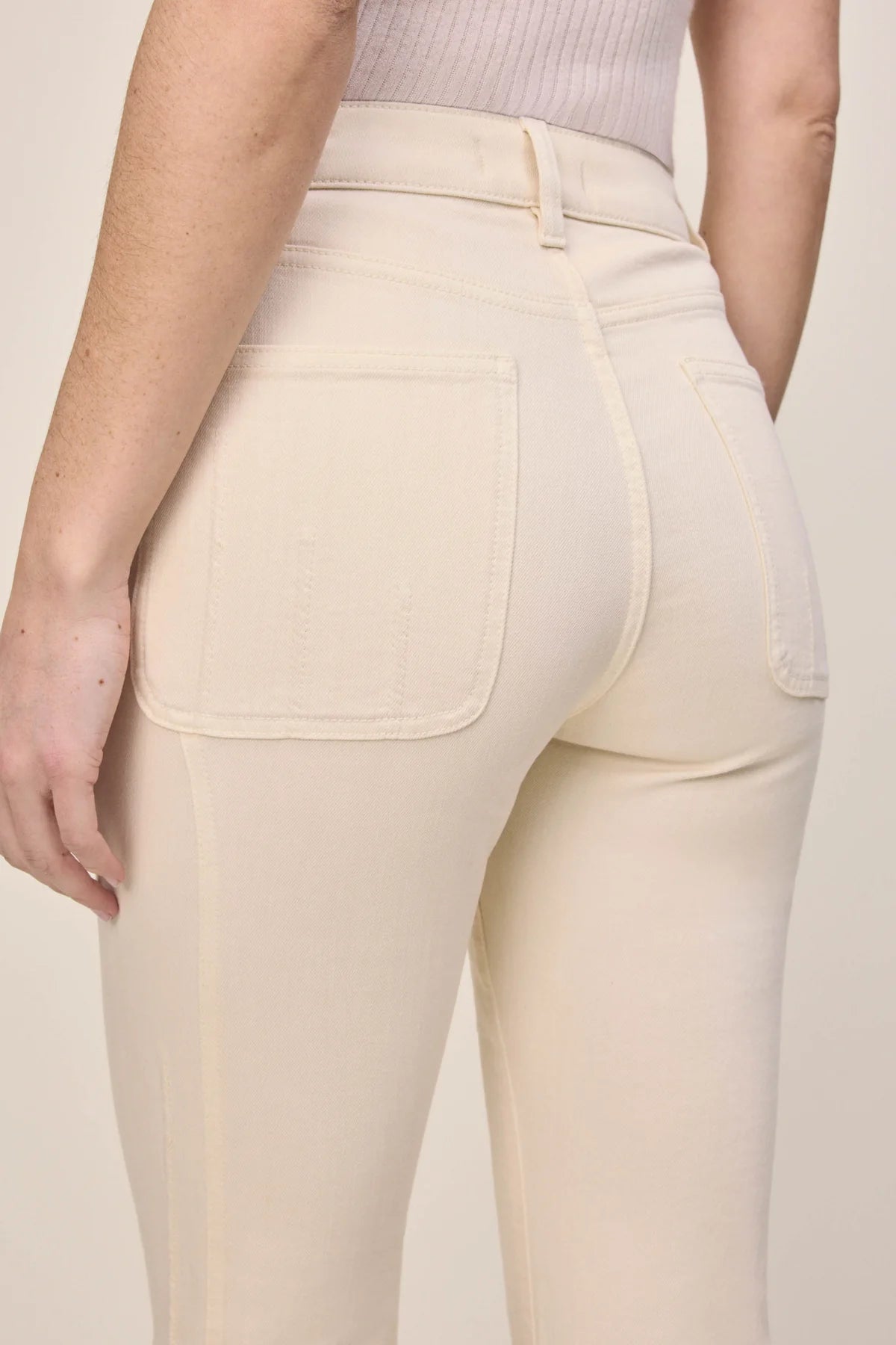 We took the best, most-sculpting high-rise top block we could formulate, and paired with with a leg-lengthening flare for a little drama. Ecru is a warm, off white wash with curved seaming detail throughout. It features a silver shank, copper rivets, tonal stitching and a clean hem.
