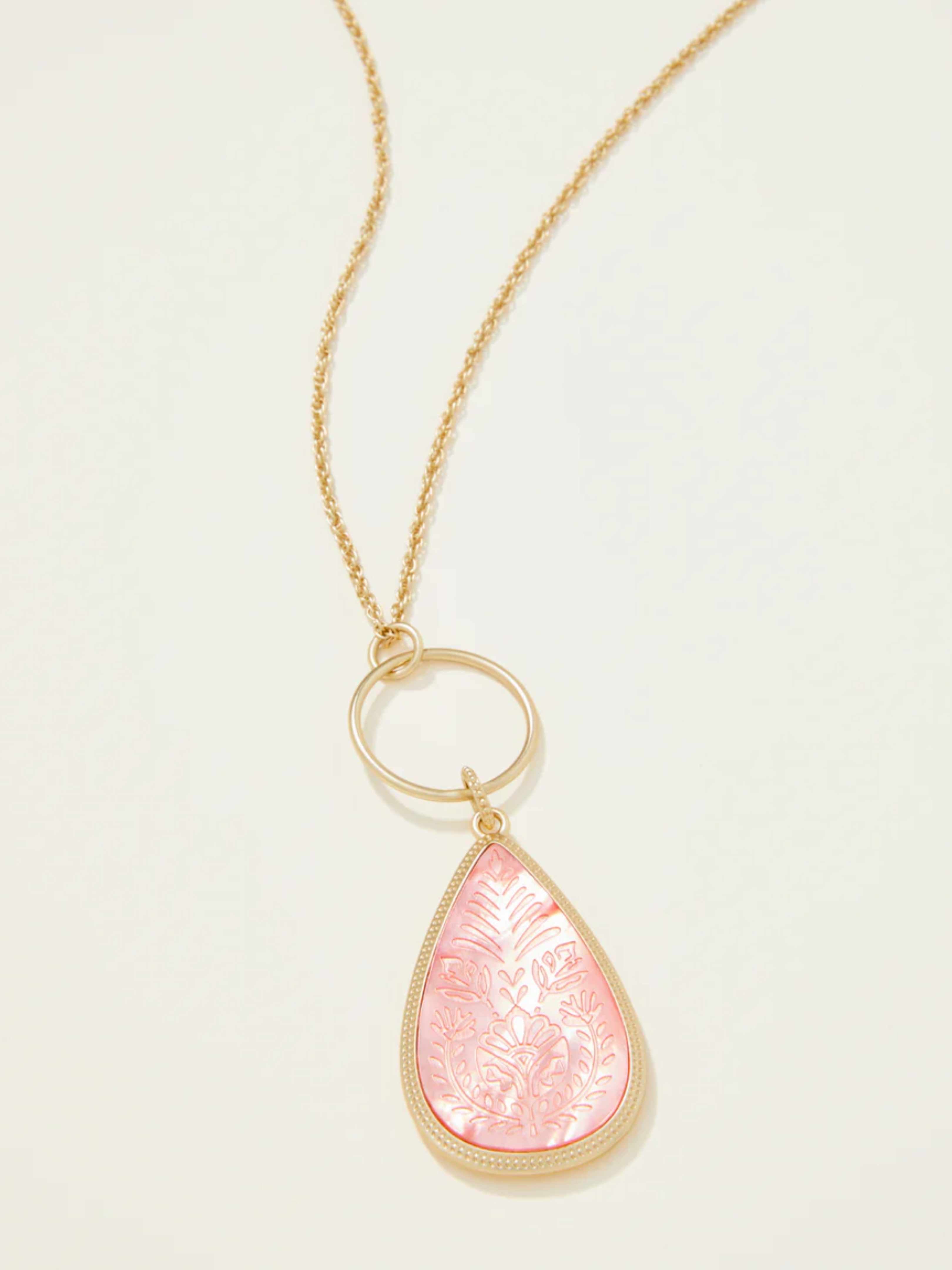 Marvel at the intricate details and shimmery effect of this delicately carved pink Mother-of-Pearl Willa Carved Necklace in Matte 18kt Gold Plating.