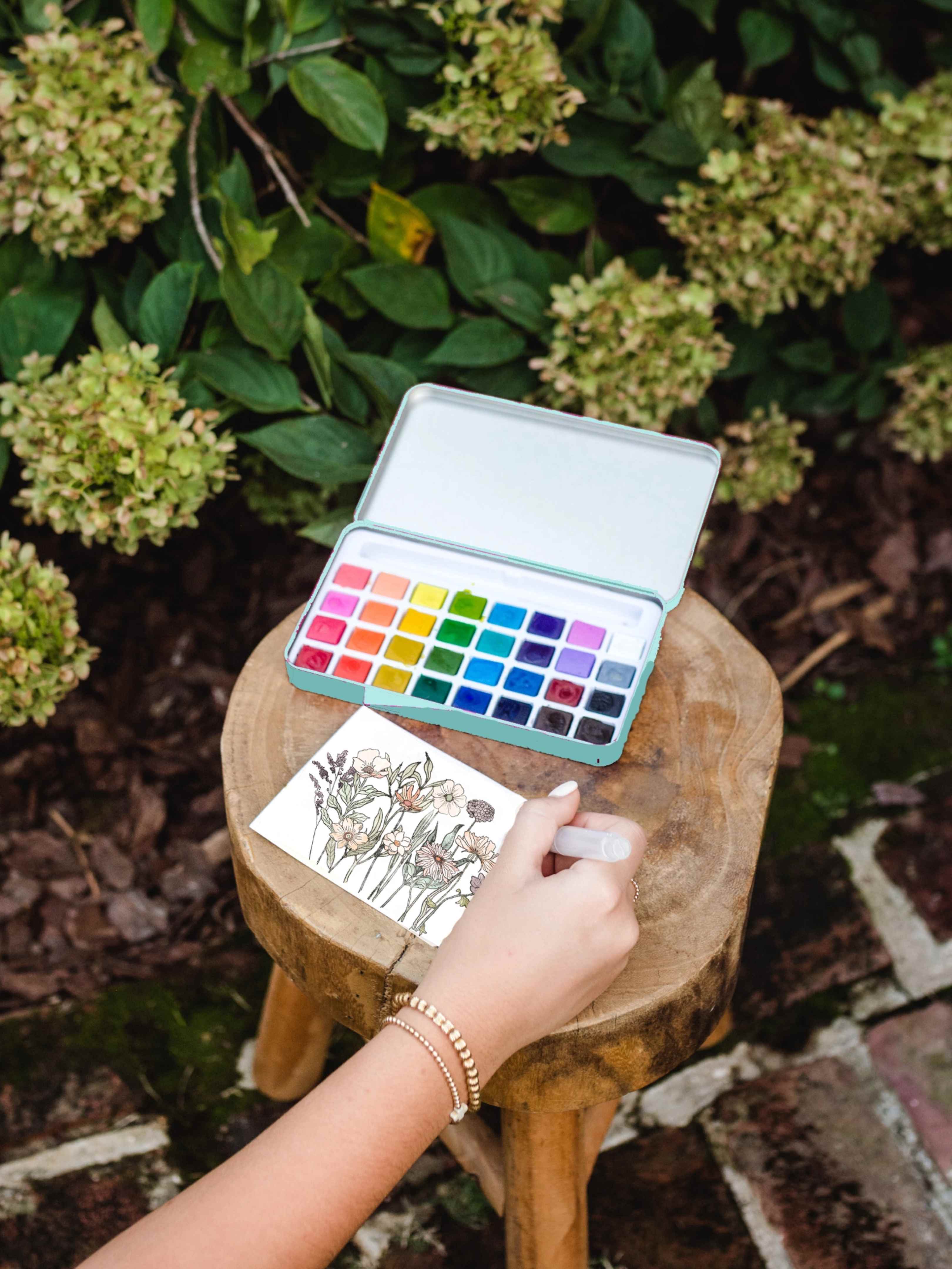 Paint your own watercolor wildflowers with these outlines and paints. This kit is compact and portable- everything packaged together in a tin painting box. Just add water to the included water brush and you can paint anywhere!